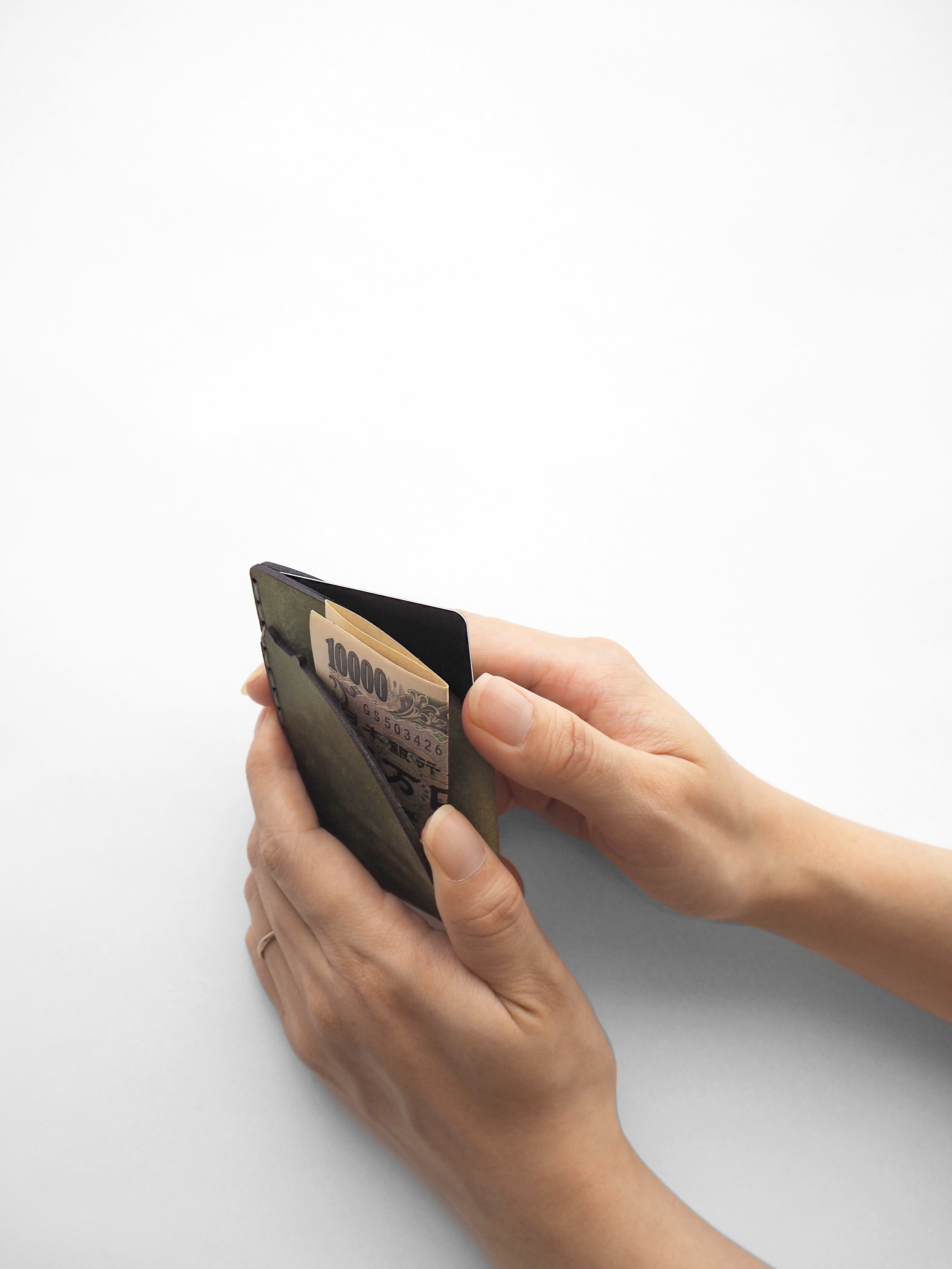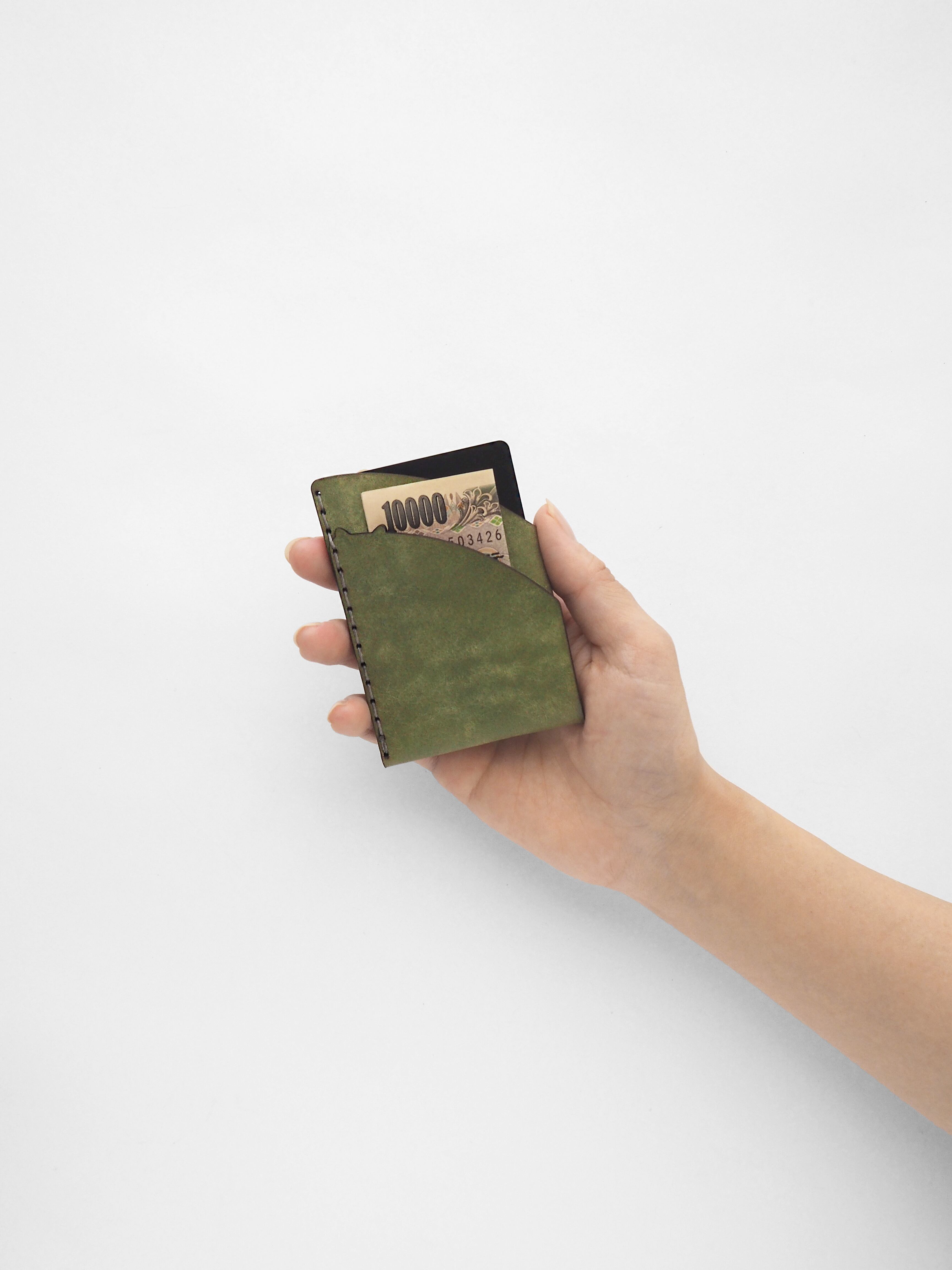 手のひらにちょうど収まるサイズ感のコンパクトさが特徴で、カードケースやパスケース、お札も挟めるのでミニ財布としてもお使いいただけます。
