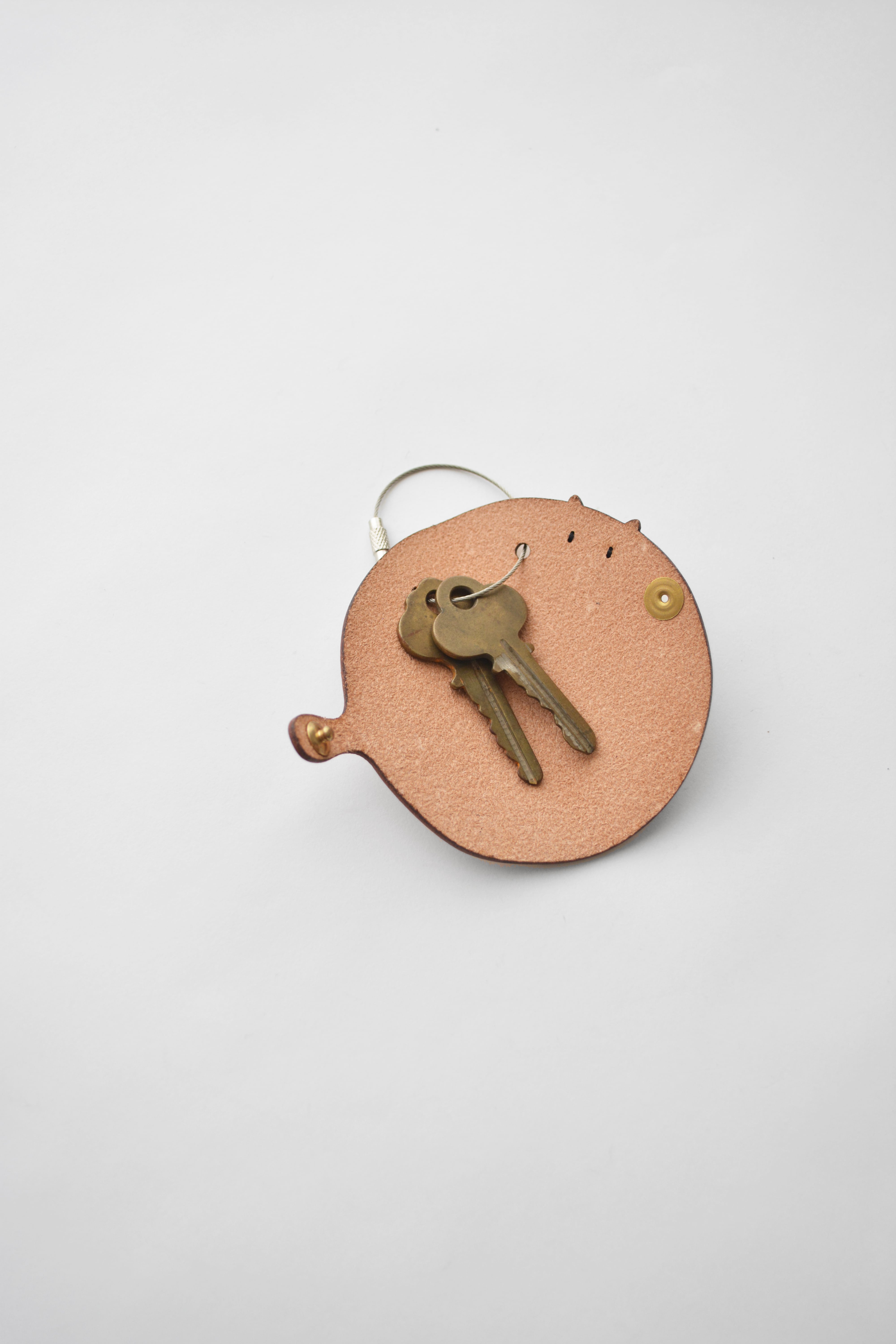 革の中に鍵を入れて、くるんで尻尾の先に付けたホックで留めるタイプのキーホルダー。